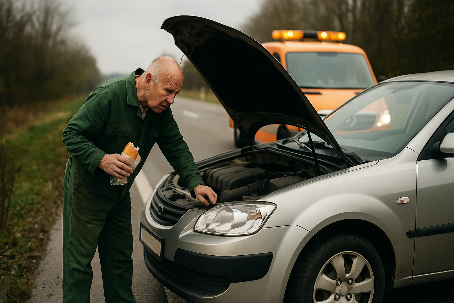 Ez a bácsi nem néz YouTube-videókat a szereléshez. Neki ott van a 37 év rutin, 49-féle kerékkulcs a csomagtartóban, és egy olyan zöld munkaruha, amit már be kellett volna vonultatni a Hadtörténeti Múzeumba. És a legjobb? Mindig van nála egy szendvics. Szalámis. Zsömlében. Mert ki tudja, meddig lesz kint a terepen.